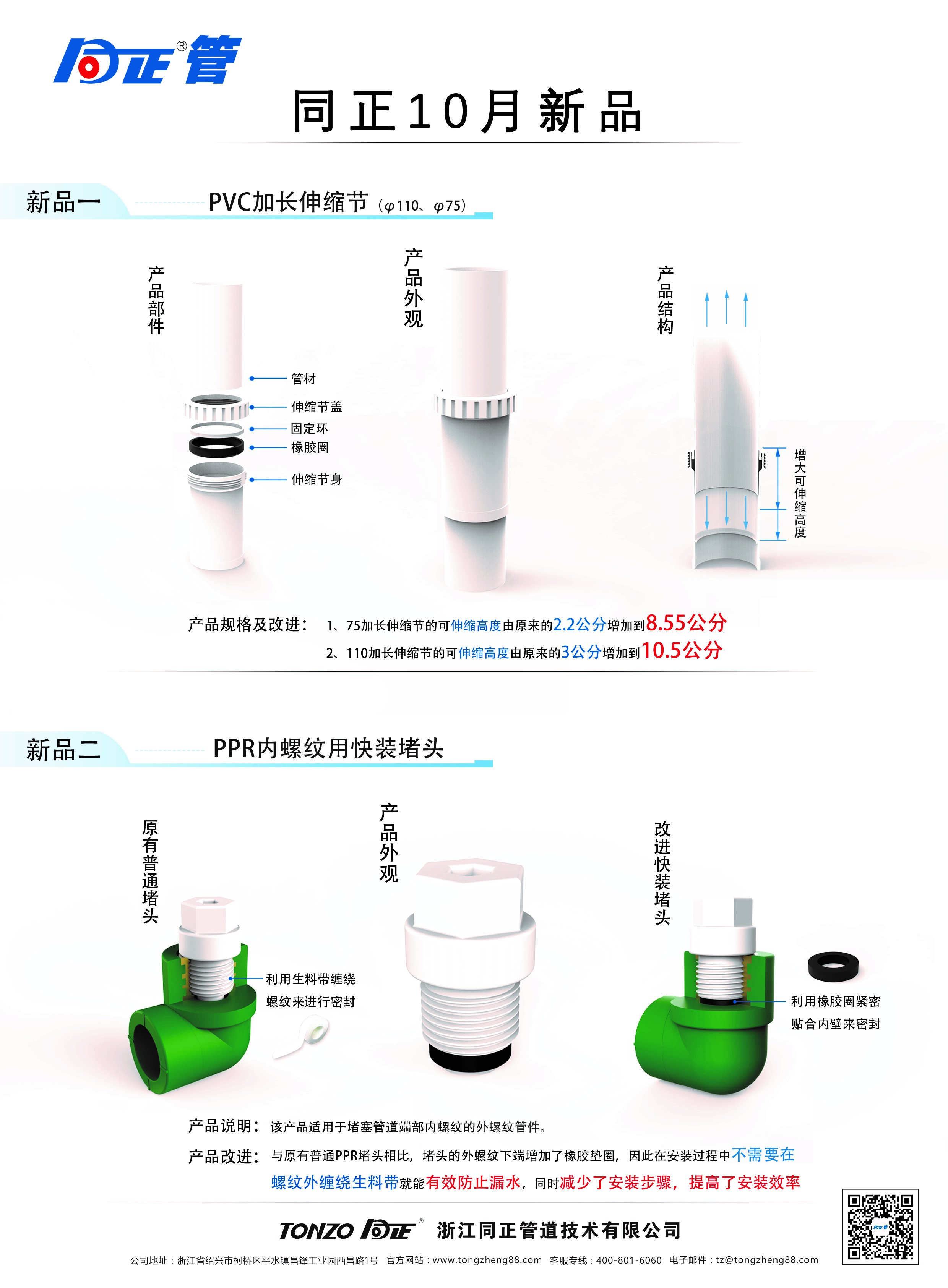公司近期開發(fā)的Ø75、Ø110 PVC加長伸縮節(jié)、PPR快裝堵頭已投入生產(chǎn)。